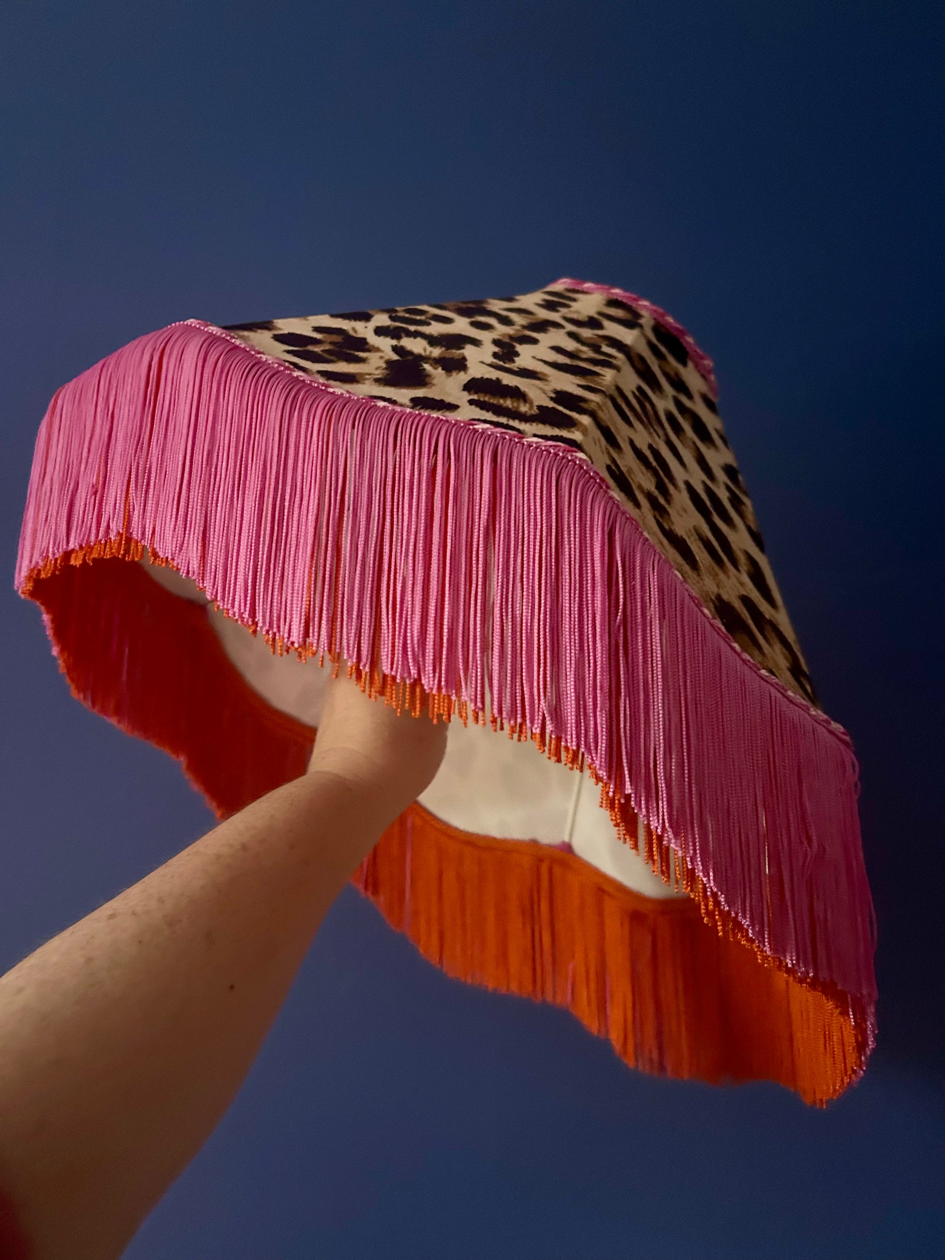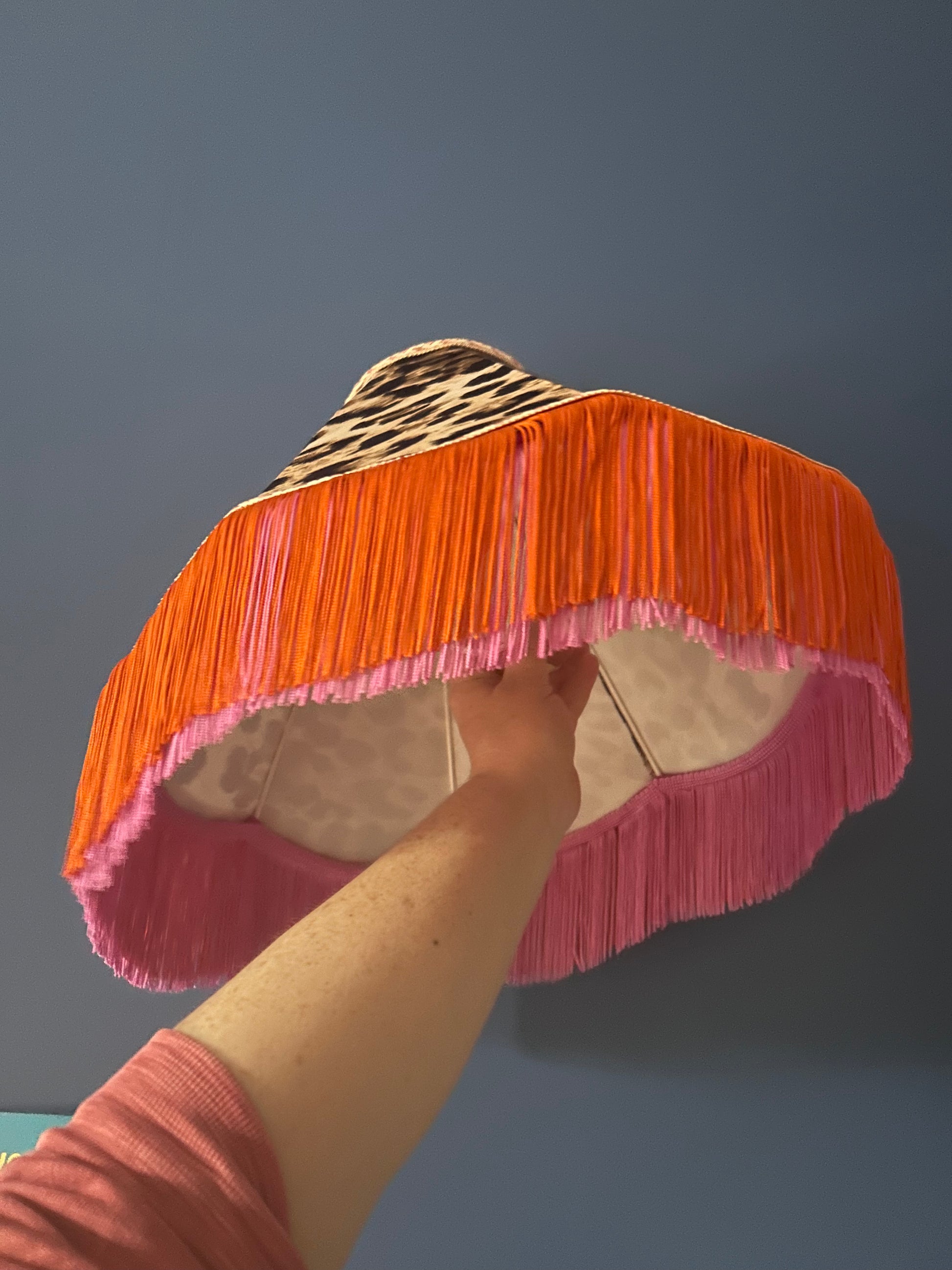 These two 16" fluted vintage lampshades have been traditionally upholstered in a soft leopard print velvet. Finished with an orange and pink fringe and pink and orange trim.