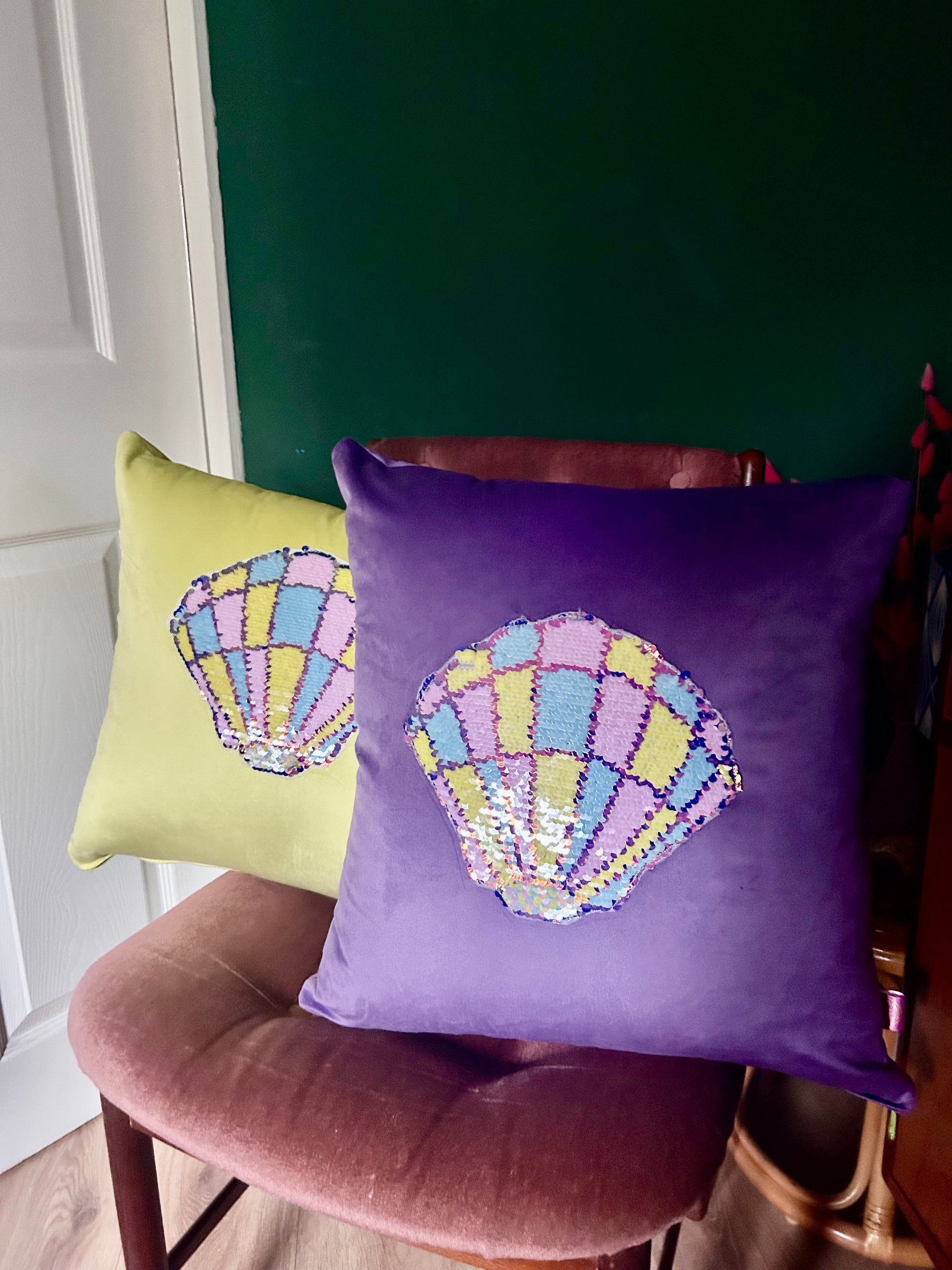 Theses cushions have been covered with super soft lilac and yellow velvet, with large sequin pastel shell.